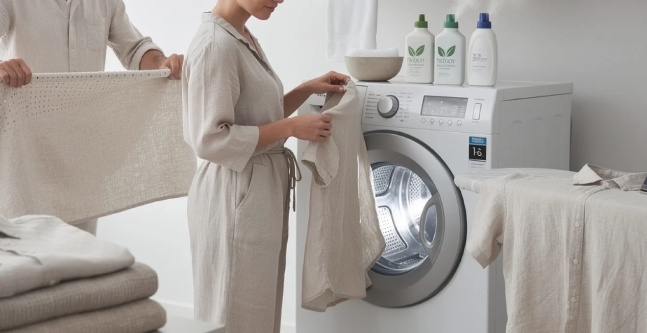 Le choix du détergent joue également un rôle central dans le lavage du lin sans rétrécissement. Privilégiez des lessives liquides ou en gel, formulées pour les textiles délicats, sans phosphates ni agents blanchissants chlorés. Les détergents enzymatiques modernes, lorsqu’ils sont utilisés à faible dose, permettent de dissoudre les taches organiques à basse température, ce qui évite d’avoir recours à l’eau chaude pour obtenir un bon résultat.