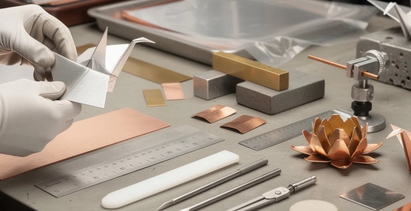 pour l’origami en métal, à condition de respecter quelques règles de base. Son état recuit réduit les tensions internes et limite les risques de fissuration lors des pliages serrés, ce qui le rend idéal pour les courbes organiques et les formes inspirées de la nature. Pour obtenir des angles précis, il est recommandé d’utiliser une règle en acier comme guide et de marquer légèrement la ligne de pli à l’aide d’une pointe sèche. Le pliage à froid doit ensuite se faire progressivement, en répartissant la contrainte sur toute la longueur du pli plutôt qu’en forçant sur un point localisé. Vous remarquerez qu’un pli réalisé en plusieurs passes douces offre un rendu bien plus propre qu’un pli brusque effectué en une seule fois.